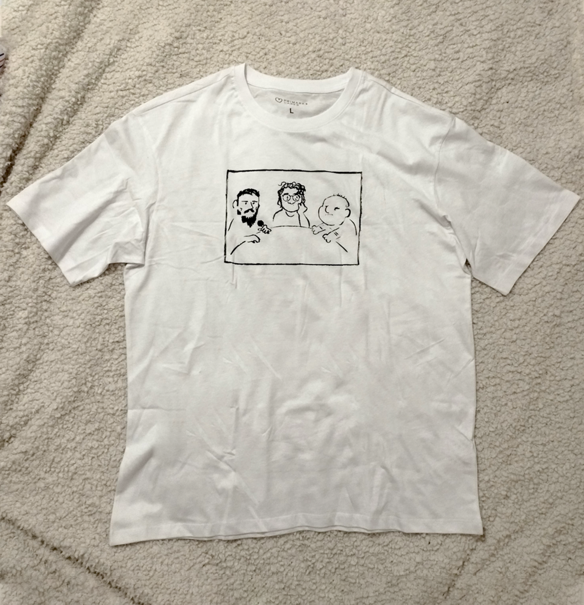 Black Linocut of the boys (Nick Mullen, Stavros Halkias and Adam Friedland) printed on 100% Cotton White Tee